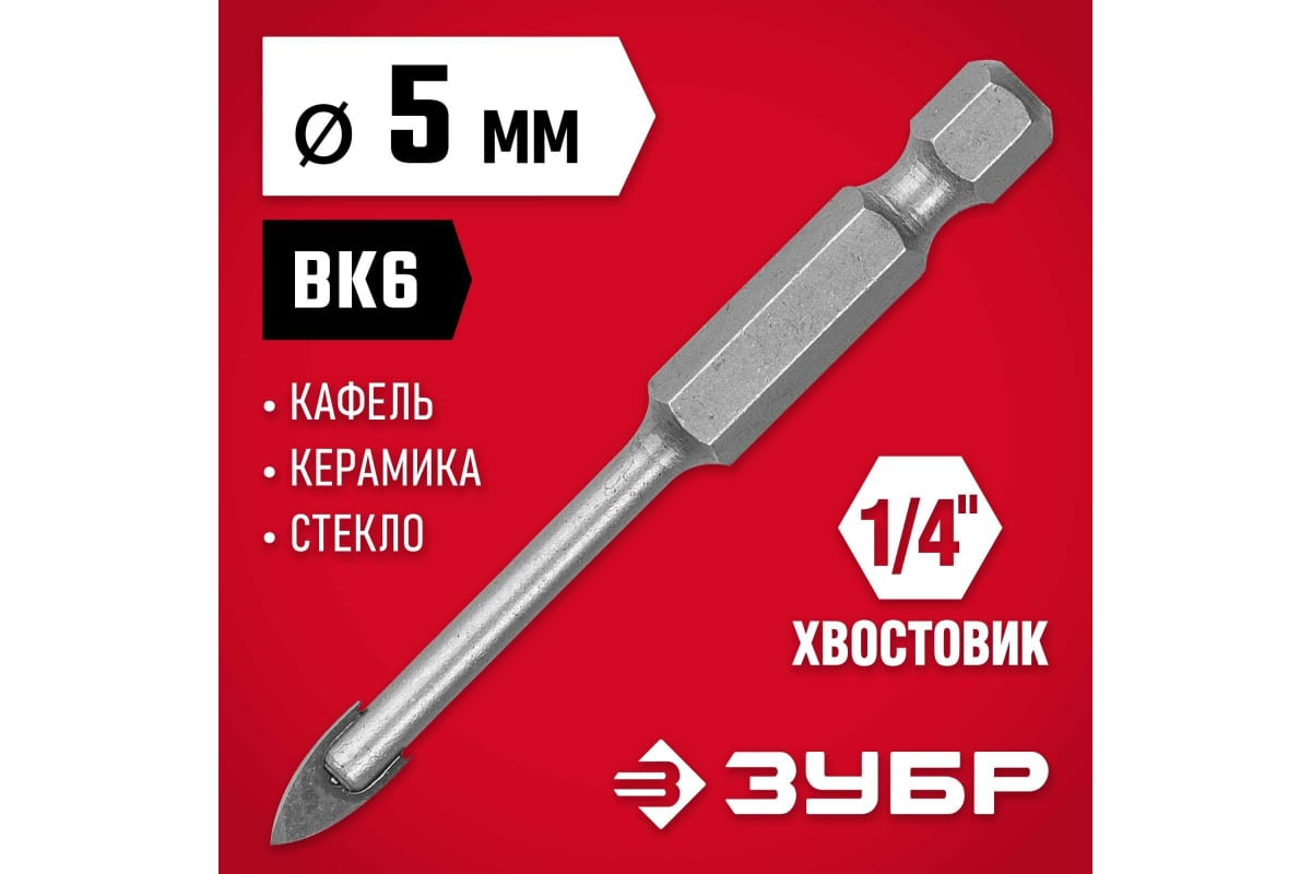 Сверло "МАСТЕР" (5 мм) по кафелю Зубр 29840-05 используется для сверления отверстий в кафеле, керамике и стекле с помощью электродрели. Оснастка имеет шестигранный хвостовик для надежной фиксации в патроне, а также твердосплавные пластины ВК6 с отшлифованными режущими кромками для эффективной работы. Сверло имеет два режущих лезвия. Используется с дрелями и шуруповертами в режиме безударного сверления. Благодаря специальной проточке хвостовика 1/4 дюйма возможно использование с быстросъёмным адаптером. Применение охлаждающей жидкости при сверлении значительно продлевает срок службы инструмента. Необходимо избегать перегрева сверла.