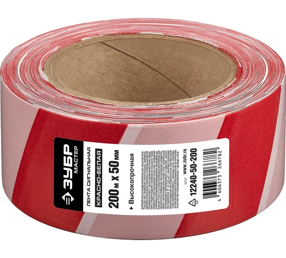 Сигнальная лента ЗУБР цвет красно-белый, 50мм х 200м, 12240-50-200 предназначена для временного ограждения опасных зон, объектов строительства, мест проведения пожароопасных, аварийных, аварийно-спасательных, ремонтных, строительных и других специальных работ с целью обозначения границ движения и предупреждения о возможной опасности. Также применяется для обозначения границ мест проведения спортивных соревнований (велосипедных, автомобильных, лыжных трасс и т.д.) и иных зрелищных мероприятий. Сигнальная лента изготовлена из полиэтилена высокого давления с нанесенным цветографичеким изображением. Обладает стойкостью к воздействию воды, высокой прочностью на растяжение и на разрыв.