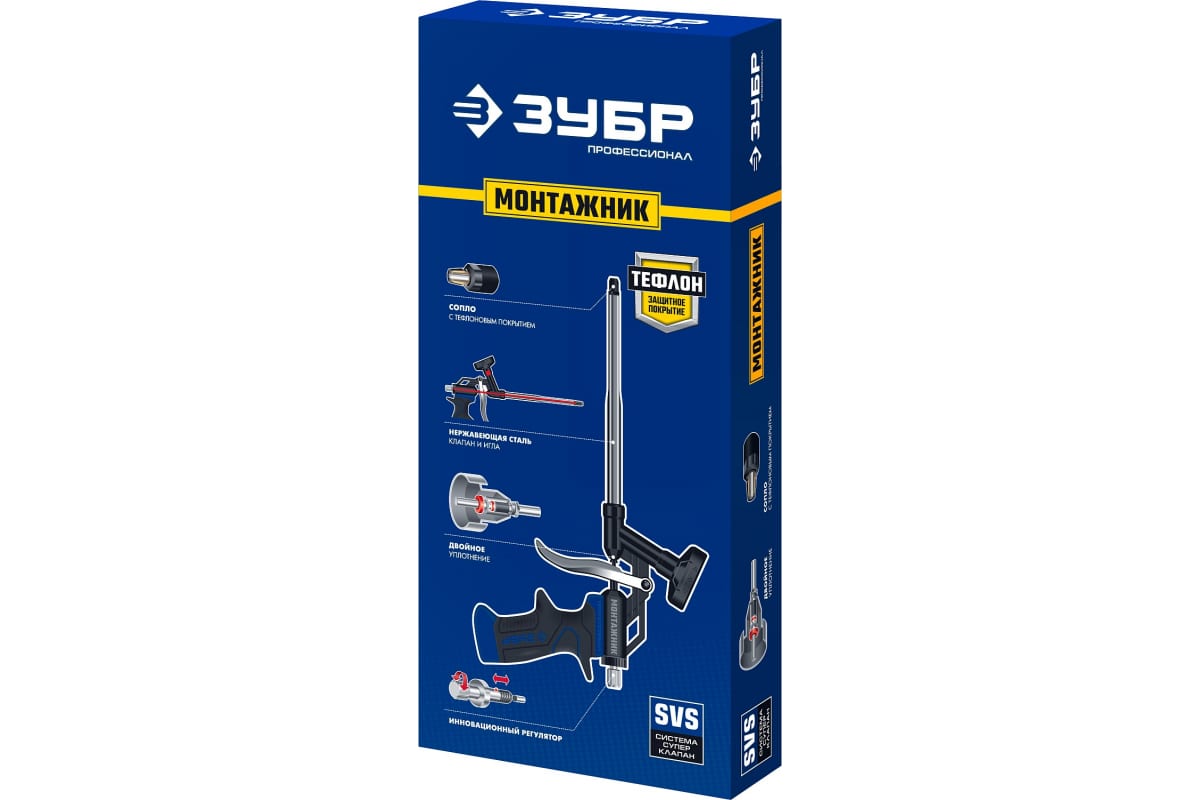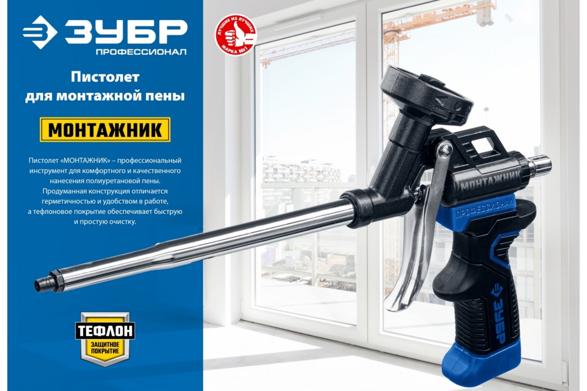 Пистолет для монтажной пены Зубр Монтажник 4-06875_z01 - профессиональный инструмент, который служит для точного и быстрого нанесения строительной смеси на поверхность.
