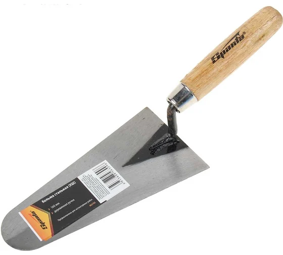 Стальная кельма бетонщика Sparta 862705 с полотном длиной 160 мм и деревянной ручкой применяется в ходе строительных и отделочных работ. Полотно треугольной формы с закругленными краями оптимально подходит для перемешивания, накидывания и равномерного распределения растворов различной плотности, заполнения вертикальных швов и удаления излишек состава. Благодаря форме рабочего полотна может применяться мастером-каменщиком в труднодоступных местах.