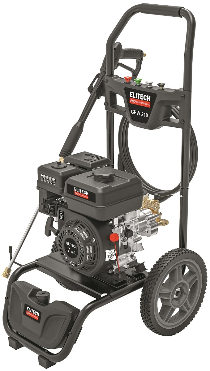 Elitech Мойка высокого давления GPW 210 HD 206091 с бензиновым двигателем мощностью 7 л.с., с четырьмя распылительными насадками, предназначена для мойки автомобилей и любой другой техники, а также террас, тротуарной и фасадной плитки, фасадов зданий и для прочистки дождевых сливов. Мойка должна работать только с чистой водой без механических примесей. Для бесконтактной мойки с применением пеногенератора используется специальное средство, предназначенное для этих целей. Мойка Elitech является самовсасывающей и может забирать воду, как из водопровода, так и из емкости с водой.